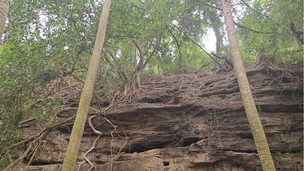 漫步湖光岩景区,看着一棵棵长在岩石上的树木,令人不解。导游小曾说:“湛江地区很多这样的情况,尤其是我们景区更多,我们叫根抱石。”亿万年前湛江地区火山活动频繁,火山喷发的岩浆冷却后形成玄武石,火山灰沉积地区大面积形成了凝灰层,与无层理的玄武质凝灰岩混杂胶结堆积在一起,形成一种特殊的火山喷发堆积地质遗迹。这种凝灰岩层形成的堆积块富含多种有机物质,当大风和鸟类带来大树的种子掉落到石缝中,在条件适合的情况下生根、发芽、生长,树根的发育是扭曲的毫无规则的,求生的本能迫使树根循着石缝扭曲且顽强地向前伸展着,吸收着凝灰岩中富含的营养。经百年千载,最终将整个石头包到了里面,形成了现在这种奇特的“根包石”现象。